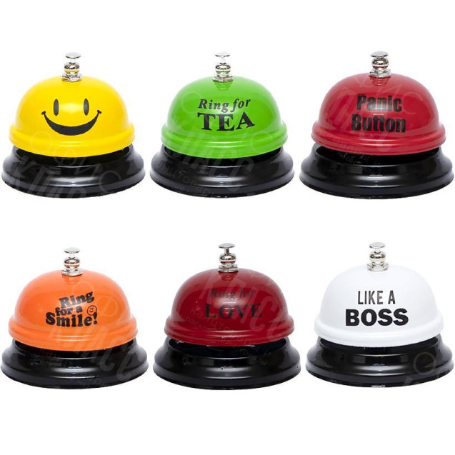 Металлический настольный звонок-колокольчик с надписью. Отлично подходит как подарок сувенир. Цвета в ассортименте соответственно и надпись разная. Размер D75мм L 60мм