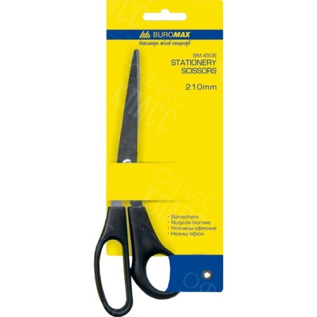 Ножницы офисные Buromax BM.4506 Офисные ножницы BUROMAX: -подходят для резки бумаги, картона, фотобумаги, ткани и т.д. -у ножниц плавный и мягкий ход резки -закругленные лезвия изготовлены из нержавеющей стали, и гарантируют безопасность во время резки -ручки выполнены из черного пластика -эргономичная форма ручек обеспечивает комфорт во время работы -индивидуальная блистерная упаковка открытого типа Ножницы BUROMAX – это качество и надежность!