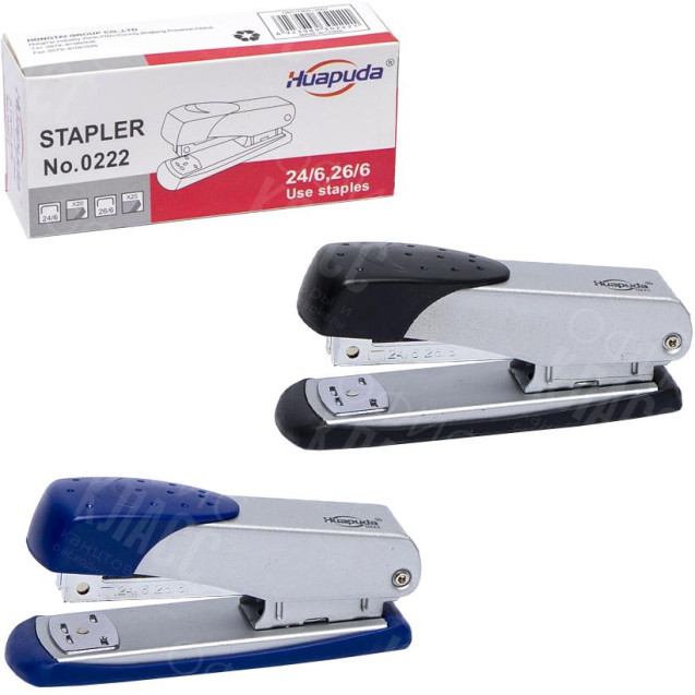 Степлер имеет металлический механизм с пластиковой накладкой, которая препятствует скольжению руки, делает работу с ним комфортной и пластиковой подошвой, скоба №24/6, №26/6, максимальная глубина закладки бумаги: 55 мм, пробивная мощность до 25 листов. Размер степлера 125х50х35 мм