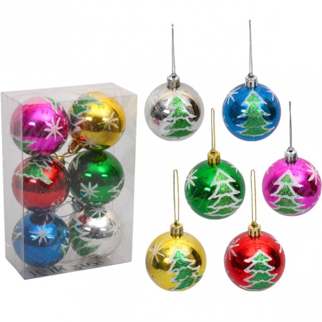 Пластиковые елочные украшения. Диаметр: 6 см. Упакованы в пластиковую коробочку 6 штук. Цвет: микс. Цена указана за набор 6шт.