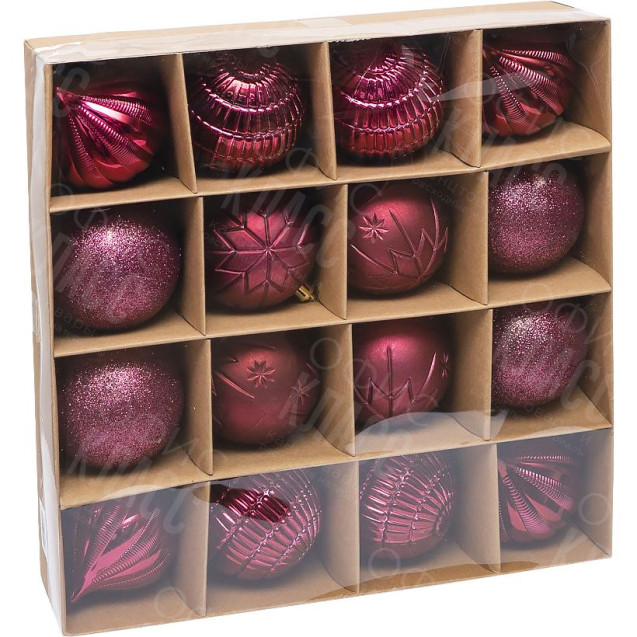 Набор шаров 16 шт.Диаметр: 8см. Материал пластик. Цвет бордо. Упакован в картонную каробку с прозрачной крышечкой 32*32*8см Цена указана за набор 16шт
