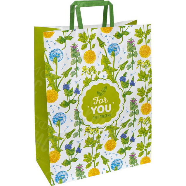 ПАКЕТ БУМАЖНЫЙ. ручки - прямоугольные бумажные цветные, 32х15х42 см, бумага 100 г/м2. Крафт цвет Белый. Печать - 4 краски пантон (основной дизайн с обеих сторон) + 1 краска-черный пантон (исходные данные+ШК). В одной упаковке один дизайн 10шт.