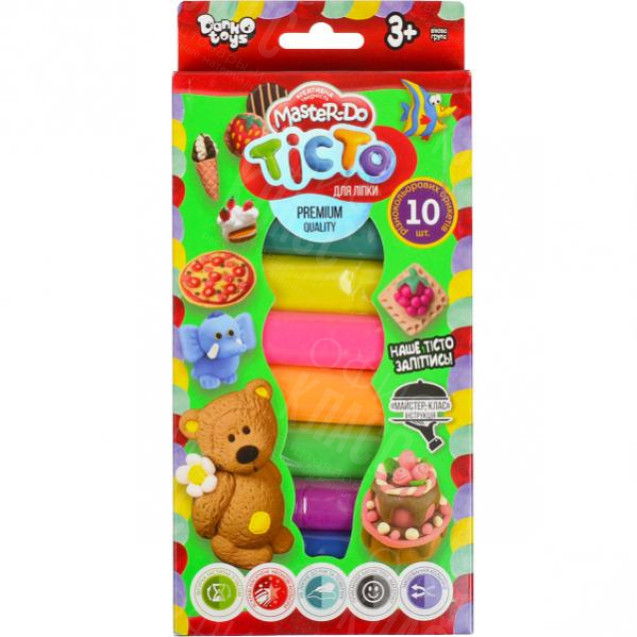 Тесто для лепки "Master Do" в коробке 10 цветов. Хорошо держит форму, позволяет прорабатывать довольно мелкие детали скульптуры .Не липнет к рукам и поверхности. Нежность и пластичность материала способствует развитию тактильных ощущений и мелкой моторики рук ребёнка. На открытом воздухе тесто затвердевает в течение 24-х часов. Для сохранения эластичности хранить в недоступном для воздуха месте. Не токсичное. Возраст 3+. Размер упаковки 12 х25 х 2,3 см. Размер бруска 10х2см