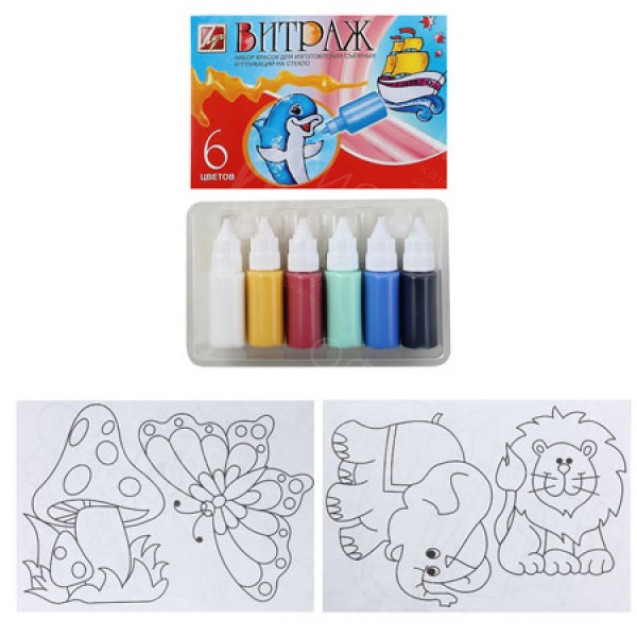 Прозрачные краски на водной основе, предназначенные для изготовления декоративных рисунков-наклеек, которые можно использовать в оформлении интерьера: для украшения оконного стекла, зеркала, вазы, холодильника, кафеля. Витражные рисунки-наклейки наносятся на гладкую поверхность без применения клея.