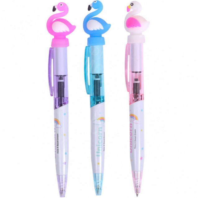 Ручка шариковая автоматическая. Пластиковый цветной корпус оснащен кнопкой вкл/выкл, съемная резиновая фигурка-наконечник, можно использовать как фонарик(3 батарейки LR626). Толщина линии 0,5 мм, сменный стержень. Цвет синий. В упаковке 36 штук. Цена указана за 1 ручку
